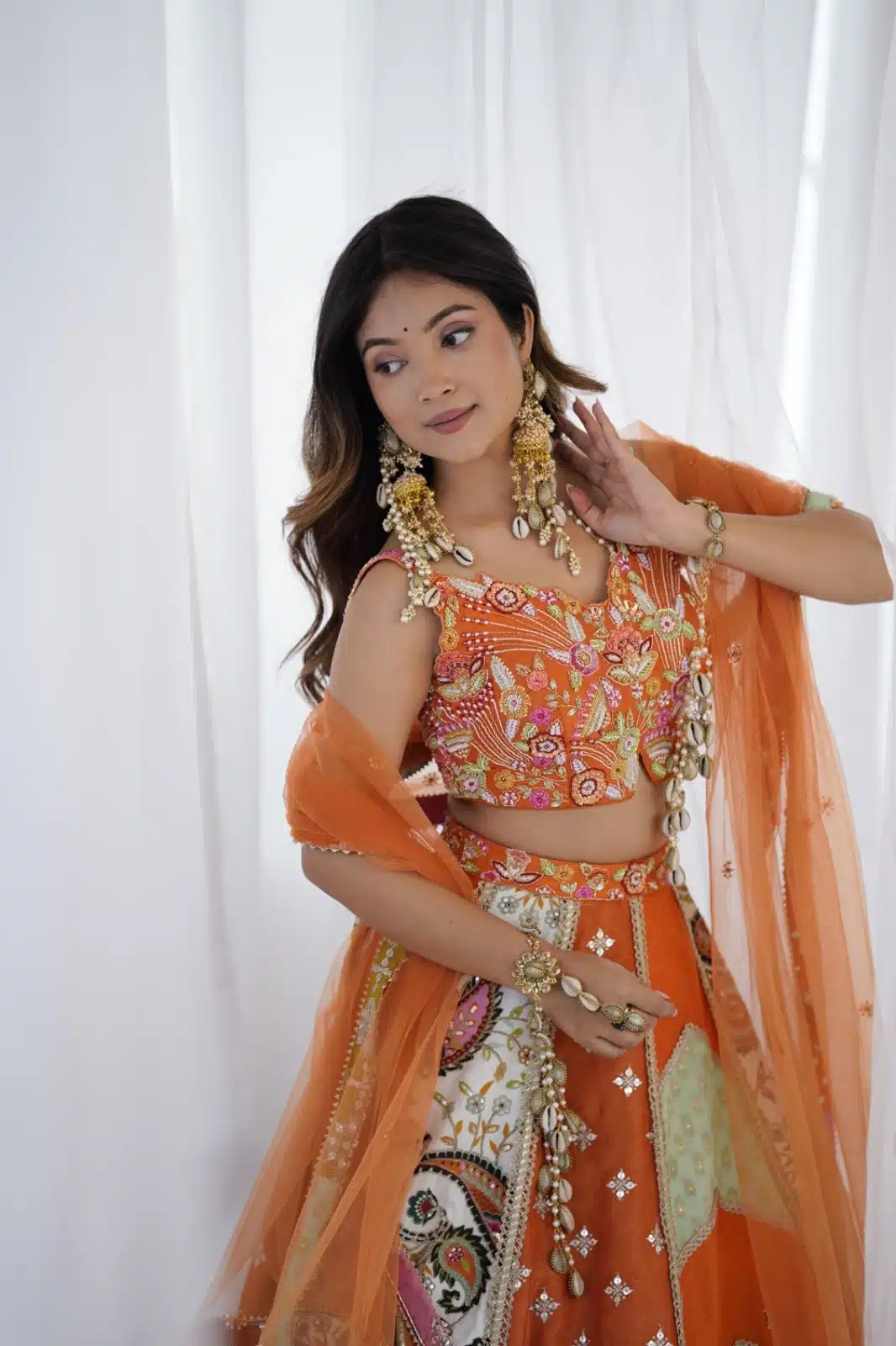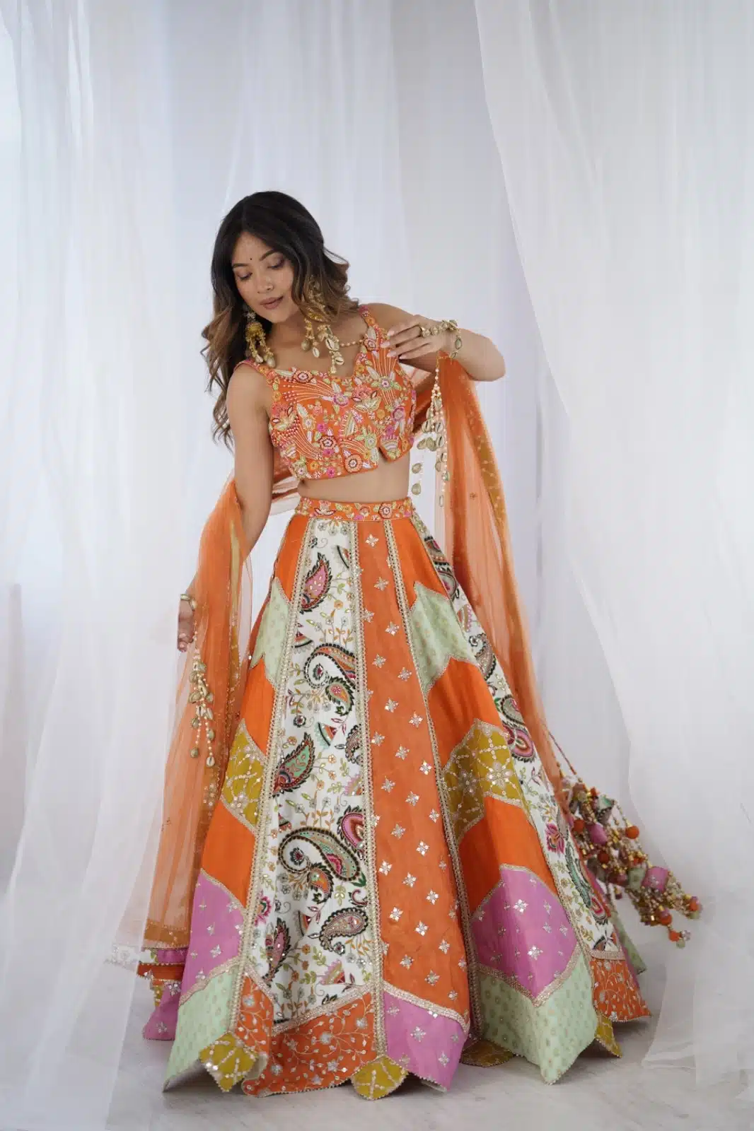 A vibrant patchwork lehenga bursting with colours and craft. Features multi-kalis in orange embroidery, paisley prints, mint green brocade, lavender gota, and yellow bandhani. Paired with a mirror-embroidered choli and net dupatta with latkans.
