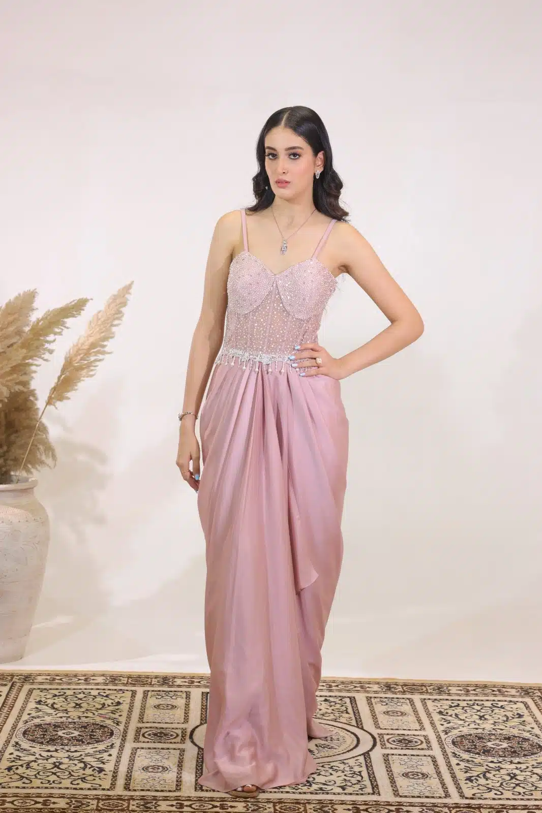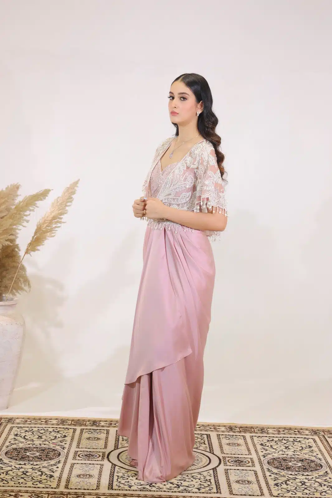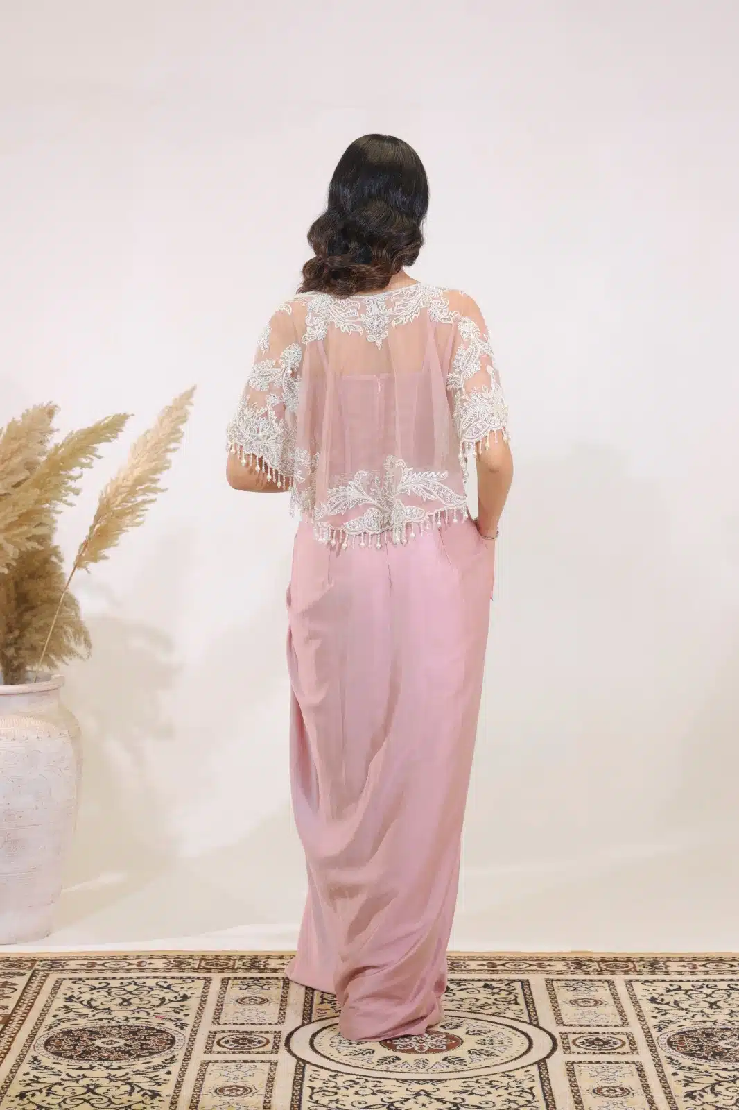 A blush pink drape skirt set featuring a netted corset and flowy cape, delicately embroidered in pearl, Moti and cutdana. Crafted in soft Armani satin and net, it’s the perfect blend of elegance and modern charm. Ideal for festive and statement occasions.