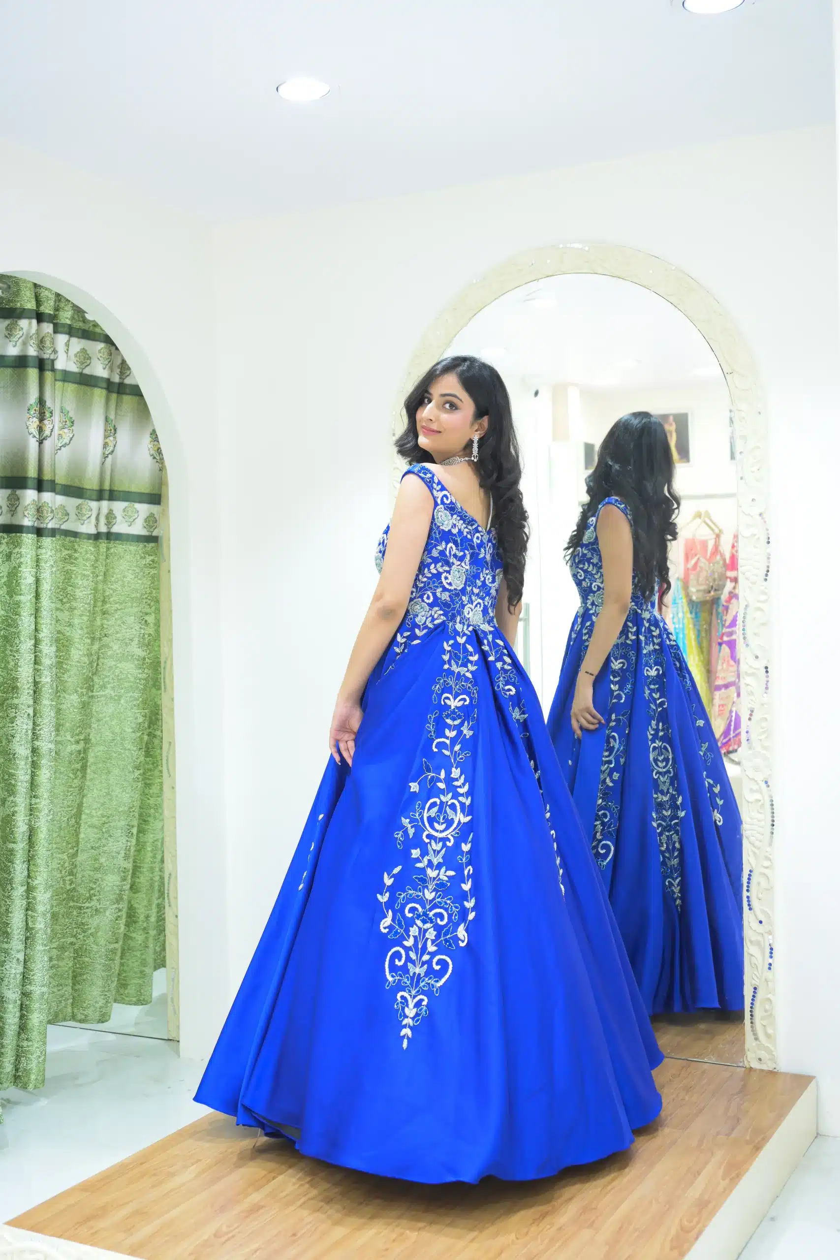 Step into timeless elegance with this royal blue gown, designed with silver floral embroidery cascading across the bodice and flare. The off-shoulder neckline adds a chic, modern touch, making it the perfect choice for receptions, formal events, or evening galas.